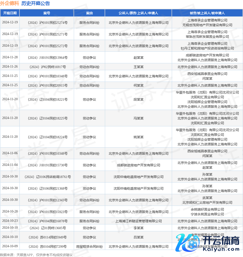 本站音信,笔据天眼查APP透露,近日公布了一则北京外企德科东说念主力资源服务上海有限公司动作被告/被上诉东说念主的开庭公告,详备骨子如下: 案号:(2024)沪02民终16917号审理法院:上海市第二中级东说念主民法院案由:就业协议纠纷当事东说念主信息: 原告/上诉东说念主:王某某 被告/被上诉东说念主:北京外企德科东说念主力资源服务上海有限公司开庭日历:2024年11月26日笔据统计,近一年内以北京外企德科东说念主力资源服务上海有限公司为当事东说念主的历史开庭公告有126则,其中案由为“就业争议”的公告以45则居首,其次为“就业协议纠纷”有42则,“服务协议纠纷”有29则。历史开庭公告(前20条)如下: