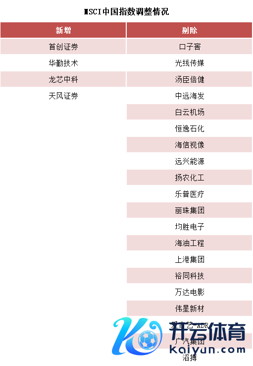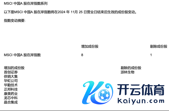 除MSCI中国指数除外,MSCI中国A股在岸指数的成份股名单也有所调度,其中增多成份股8只,包括始创证券、供销大集、华虹公司、华勤技艺、正邦科技、康好意思药业、龙芯中科、晶书籍成,剔除了派林生物。