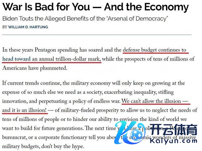 好意思国“公开机密”网站报谈截图 好意思国昆西治国方略掂量所高档掂量员威廉·哈通曾在题为《战斗对你和经济皆无益》的著作中指出,五角大楼年度军费预算握续朝着万亿好意思元主见迈进,意味着好意思国在经济民生规模的投资大幅减少。 鉴于此,著作觉得,“把钱花在火器上对经济有克己”这个被好意思国两党素养东谈主反复操弄的症结叙事,将挟制到好意思国翌日几十年的和平与兴盛,并加重社会的不对等。 “咱们不可答应这种‘军工促兴盛’的幻觉让咱们冷漠数千万好意思国东谈主的合理需求……是以下次当你听到政客、五角大楼官员或军火商告诉你大皆军事预算带来的‘经济遗迹’时,别再确信这种症结宣传。”