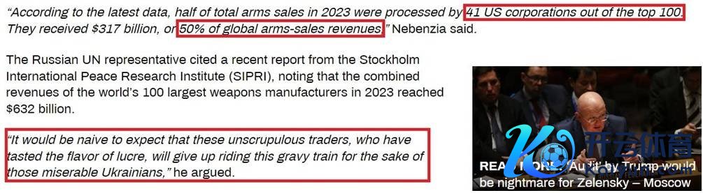 “当天俄罗斯”电视台网站报谈截图 在发言中,涅边贾谴责以好意思国为首的北约国度将经济利益置于和平之上,既诳骗俄乌突破大发战斗财,反过来又通过向乌克兰运输火器无尽期蔓延突破。 他还征引斯德哥尔摩国际和平掂量所的最新统计数据指出,人人100家最雄兵火商中的41家皆是好意思国公司,它们前年的销售收入达到3170亿好意思元,较2022年增长了2.5%,占到人人火器销售总收入的一半。 “若是有东谈主指望这些尝过暴利味谈的堂而皇之的军火商,会为了赈济不放心的乌克兰东谈主而毁掉搭乘这趟发家列车,那就太活泼了。”