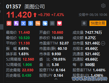 8月26日音讯,好意思图公司拉升涨超7%,最高波及11.44港元,年内已累涨逾3倍。领域发文,好意思图公司涨7.43%,报价11.42港元,成交额逾8亿港元。