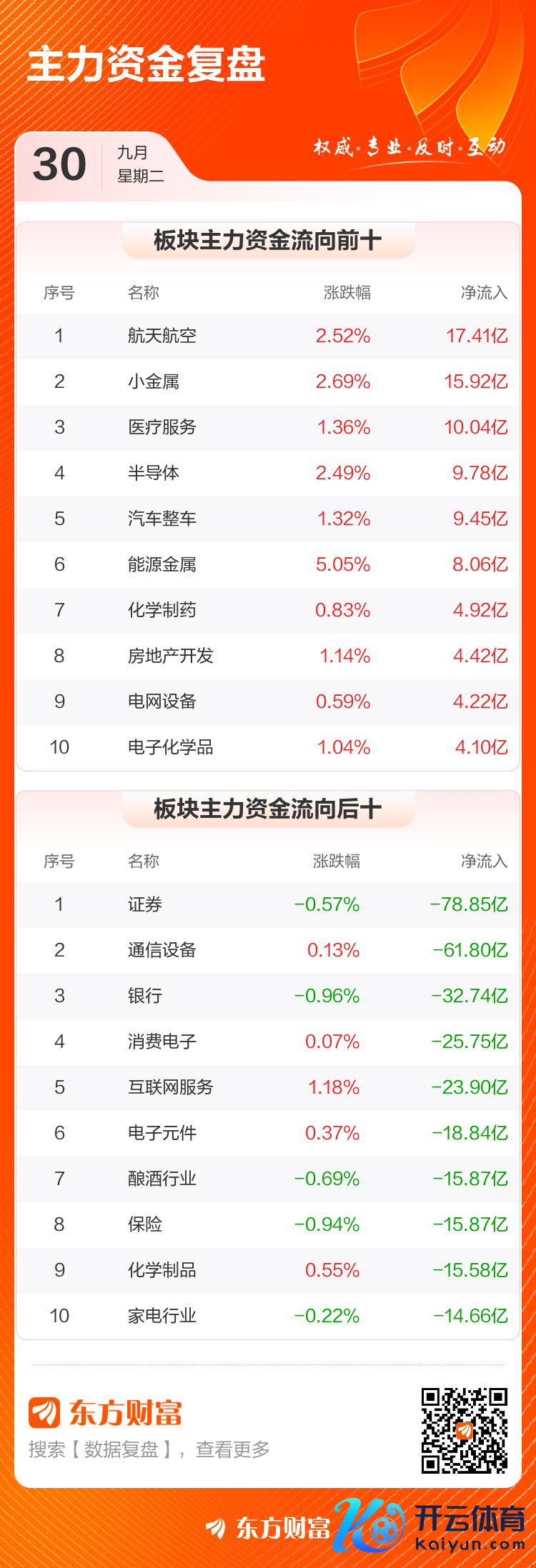 9月30日,沪指涨0.52%,深成指涨0.35%,创业板指涨0%。两市成交额2.18万亿,较上个往来日放量200亿。数据表示,本日大盘主力资金净流出379.13亿。航天航空、小金属、医疗职业等板块主力资金流入名次居前,其中航天航空净流入17.41亿元。