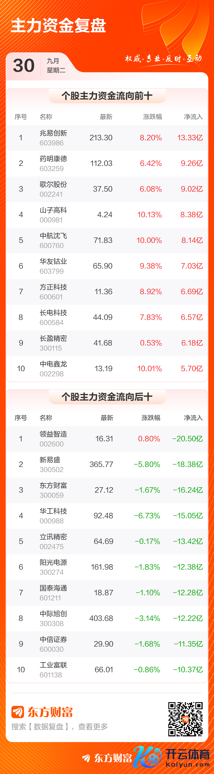 主力净买入个股中,兆易改进名按序一,主力净买入13.33亿元;药明康德名按序二,主力净买入9.26亿元。 主力净卖出个股中,领益智造名按序一,主力净卖出20.50亿元;新易知名按序二,主力净卖出18.38亿元。
